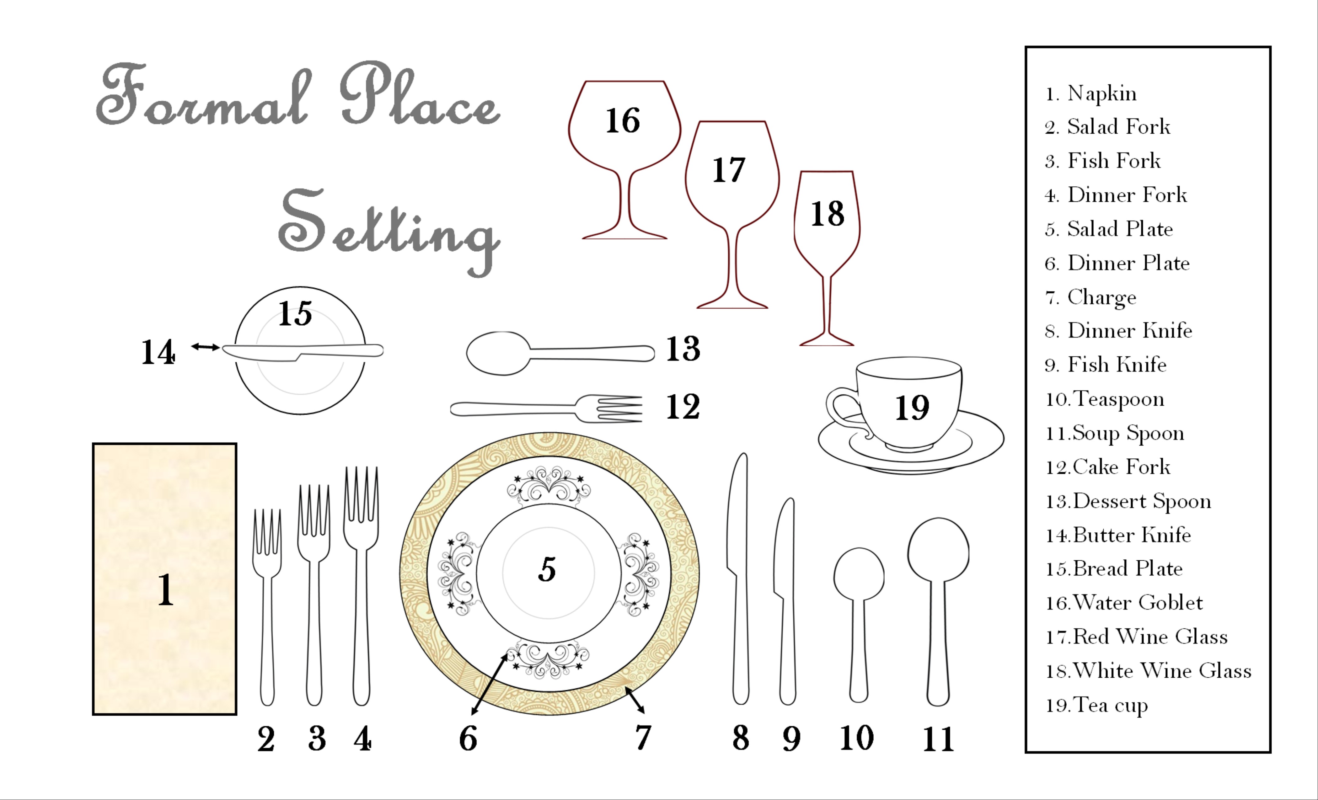 A formal place setting is typically something you will see at fancy restaurants with terribly small food portions or at weddings. Sometimes there are way too many drink glasses that you don’t have to worry about unless you recently discovered that you are meant to be a sommelier. The rule of thumb is red wine in wider glasses (for aeration; you can pretend to be a red wine snob by swirling it), white wine uses a glass thinner than the red wineglass, and the thinnest glasses (aka “flutes”) are for champagne/sparkling wine. (Bonus tip: champagne is sparkling wine from the Champagne region of France. Sparkling wine can be made anywhere.)